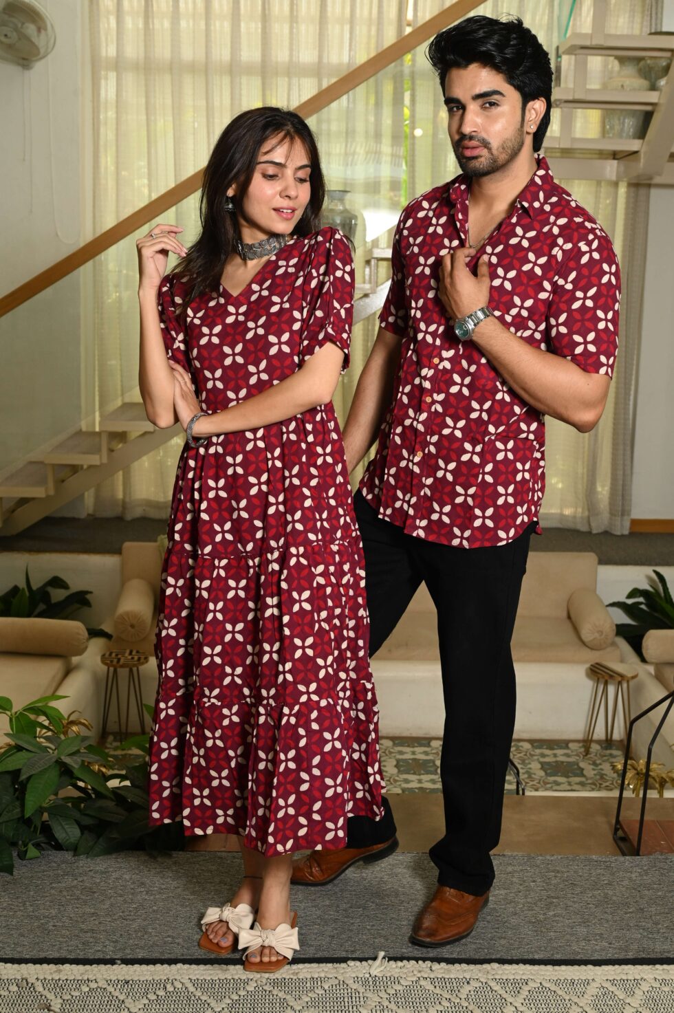 A bold and elegant maroon cotton outfit featuring a white floral print. The puff-sleeve dress with a flowy silhouette and the collared shirt make the perfect combination for festive occasions, outings, and casual celebrations.
