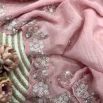 Designer Pixcel Crush saree with elegant Katdana, pearl work, plain blouse, graceful look, perfect for parties and special occasions.